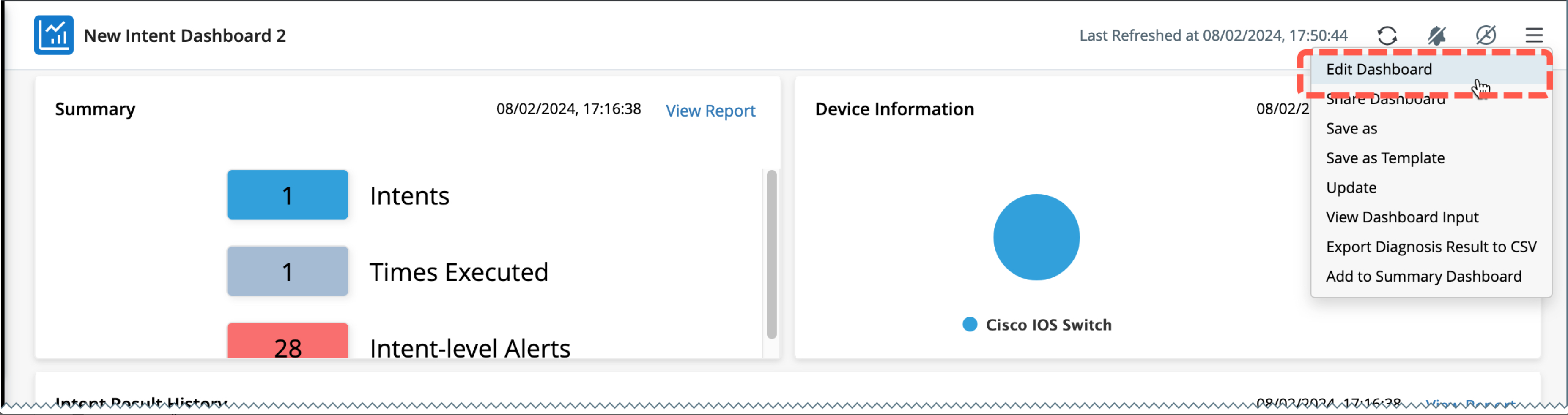You can modify the Intent Dashboard in Edit mode by selecting the option located under the menu