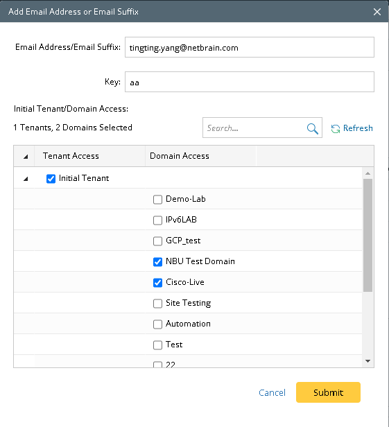 In the system, you can specify key and accessible tenants and domains for the email address or email suffix who can use triggered diagnosis by email.