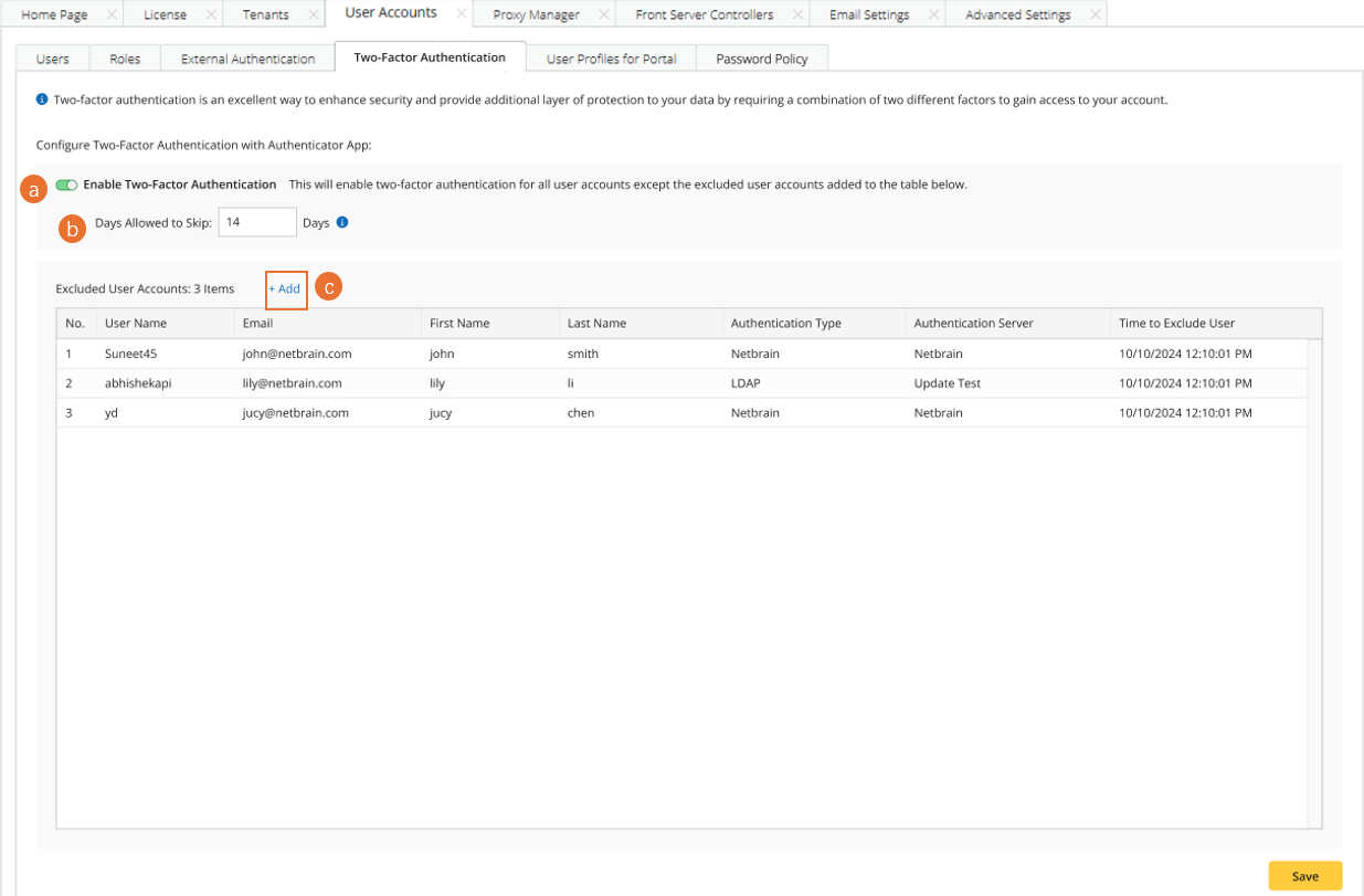 c. Add excluded user accounts: Select users accounts that do not need to complete two-factor authentication for login. For instance, System Admin account can be set as excluded user account so that System Admin can log in to NetworkBrain in case of emergency.