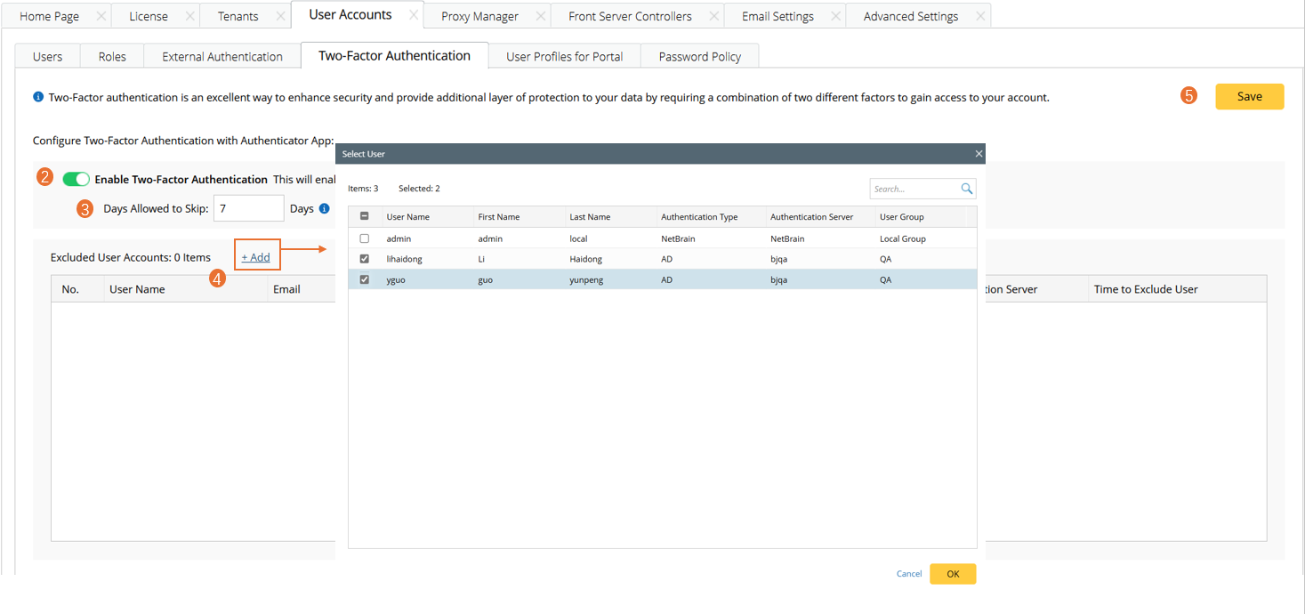 - Turn on Two-Factor Authentication, then two-factor authentication will apply to all user accounts in the system except the excluded user accounts. This function is disabled by default.