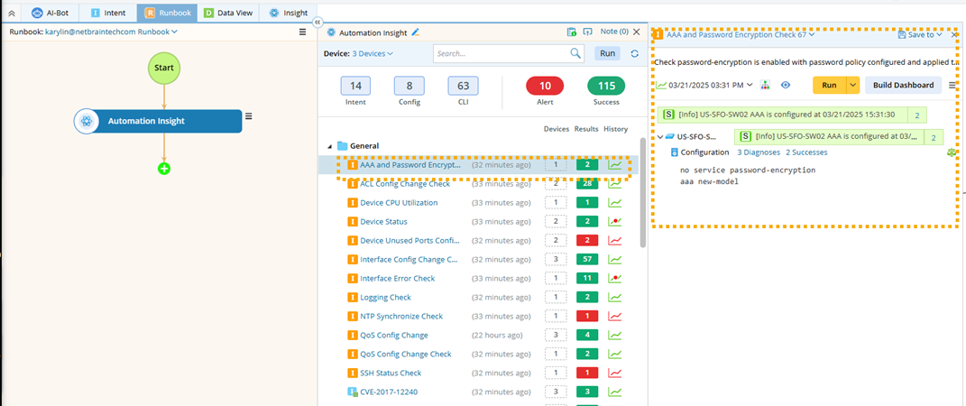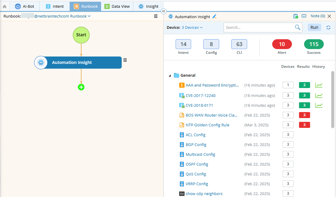 - After adding an insight node to the runbook, you can view the map devices’ automation results. The automations are grouped by category.
