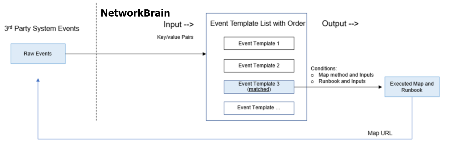 An event template is a customized executor in the NetworkBrain system to process events from a specified 3rd-party system, including mapping problem areas and executing runbooks based on predefined event conditions. With this feature, you only need to define general event templates in the NetworkBrain system, and they will process event analysis when receiving the 3rd-party events. An event template is supposed to process events from a third-party system and you can create different event templates to process events from different third-party systems.