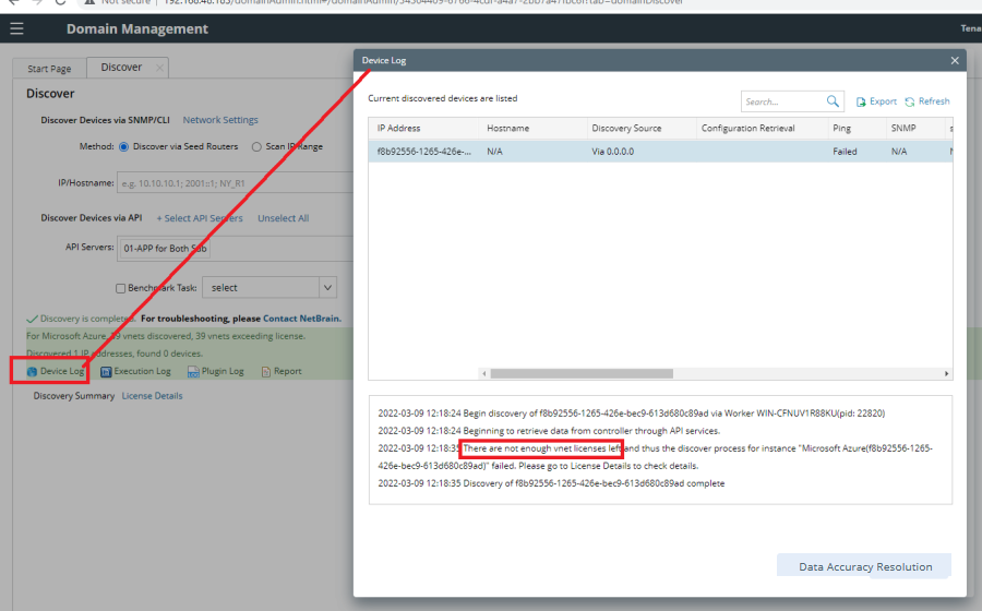 If no device can be found after discovery, review the Device Log and find the error message such as "There are not enough vnet licenses", follow the instructions below.
