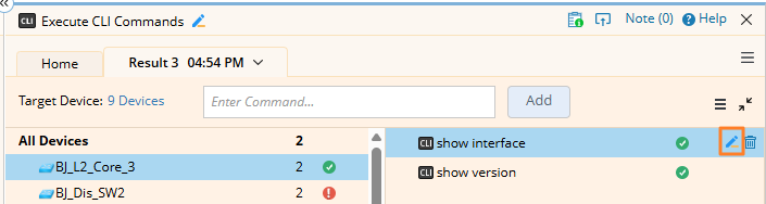 - After the execution is finished, select a device and a CLI command to view its output.