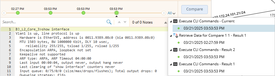 In addition, you can use a parser to parse key metrics from the outputs, monitor them on a map, and see the displayed alert if the target parser variable deviates from the Golden Baseline. You can also compare CLI command outputs from different times to view their differences.
