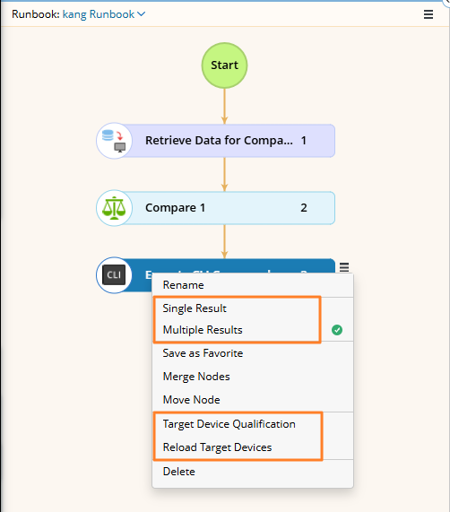 Tip: If a runbook has already been opened, the Execute CLI Commands node will be added to the current Runbook; otherwise, it will be added to the personal Runbook. - Add a command for all target devices by entering the command directly, then click Add.