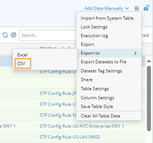 Export ADT to CSV file: Click Export to from the drop-down menu of an open ADT, then select CSV to export the file to CSV format. The exported CSV file will be automatically saved to the default location for storing downloaded files (for example, C:\Users\<your username>\Downloads).