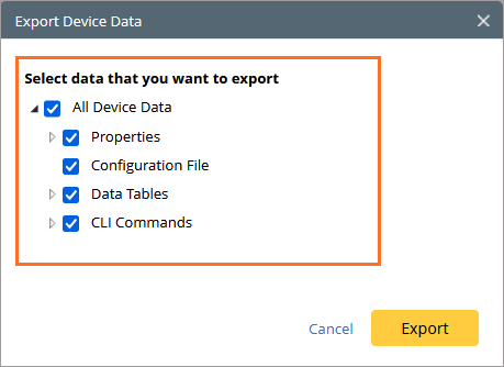 Tip: The configuration file is exported in .config format, the CLI command outputs are exported in .txt format, and the data tables and device/interface/module properties are exported in .csv format.