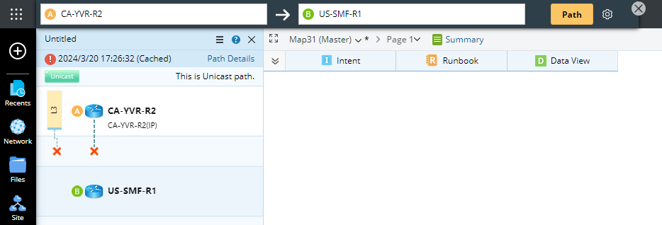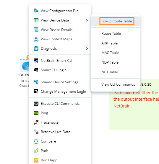 - On a map, right-click the target device CA-YVR-R2, and select View Device Data > Fix-up Route Table.
