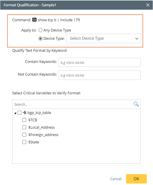 Note: The UI for defining CLL command qualification will appears when the parser is CLI Command type parser. To define CLI command qualification, see Define CLI Command Qualification. ![]() |