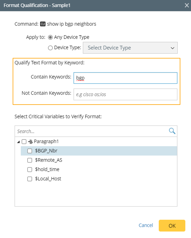 - When device commands are retrieved, the formats in the parser will be matched by the keywords inputted for qualifying text format. Then the matched formats will be further filtered by critical variable rules.