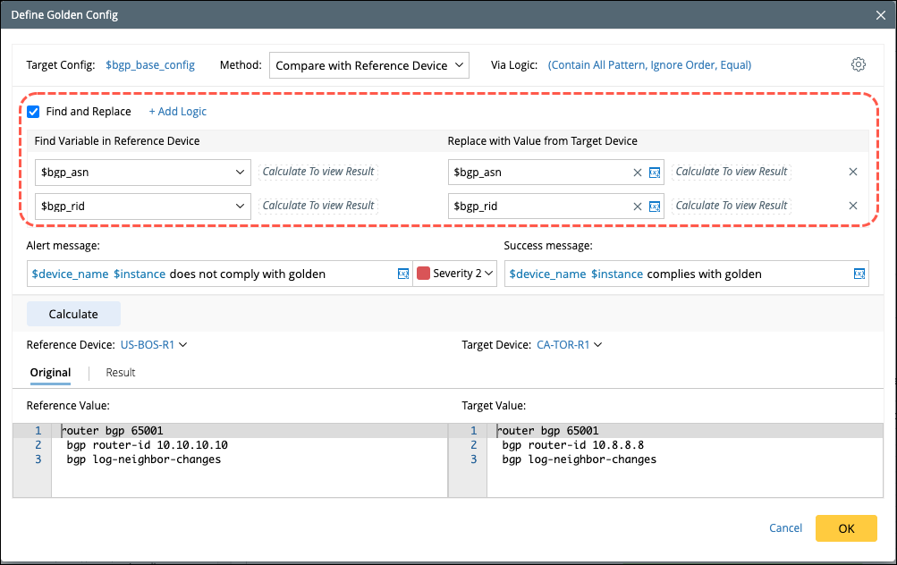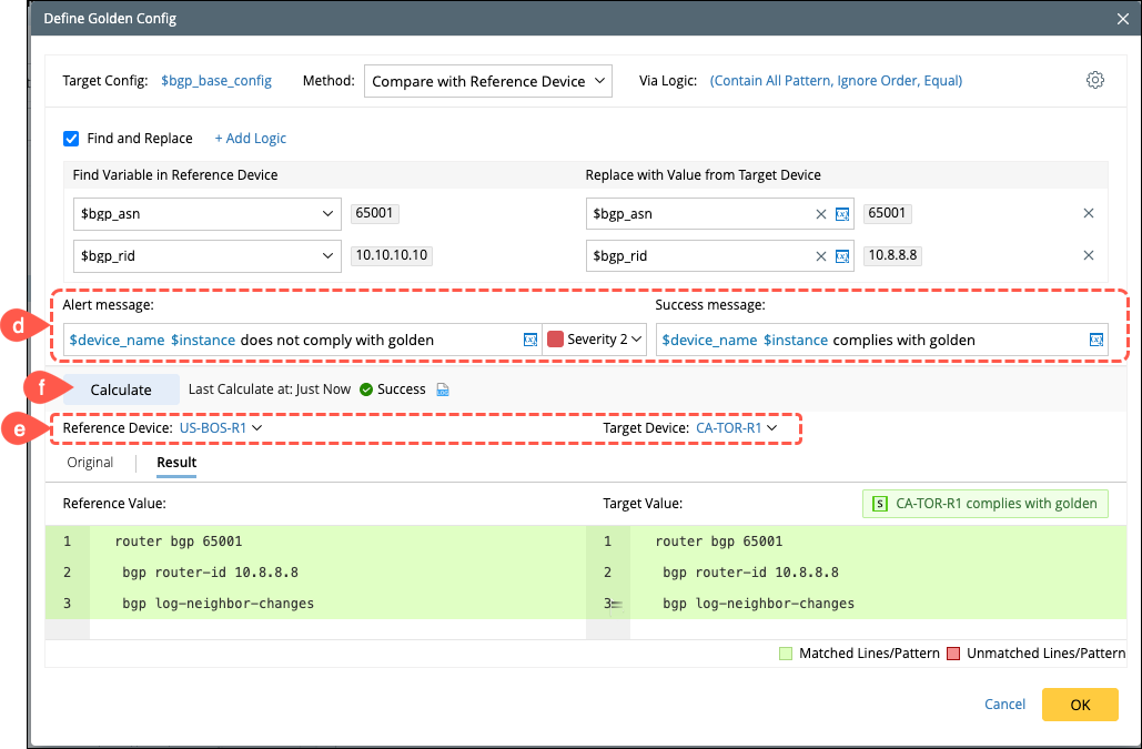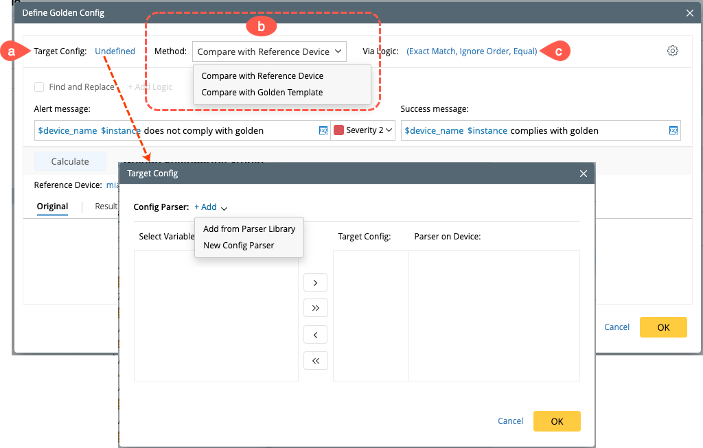 Compare with Golden Template: Insert the golden Parameter and Parser Variable in the Golden Config Template to compare with the target Device config.