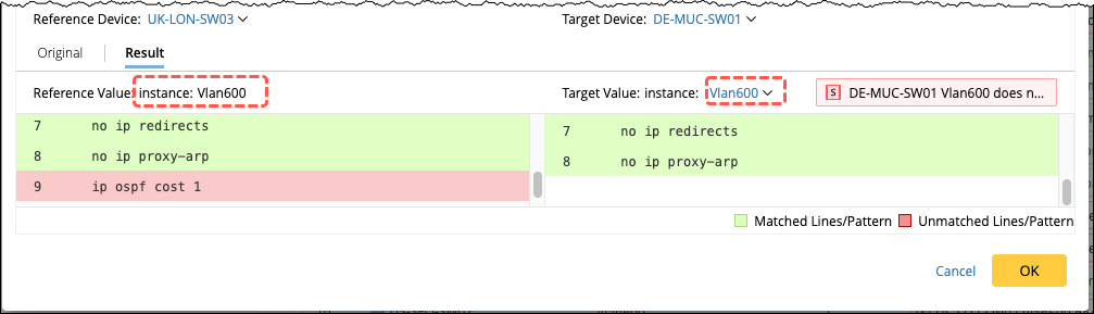 Note: When performing the config comparison at the interface level, provide the instance information for both reference and target instances.