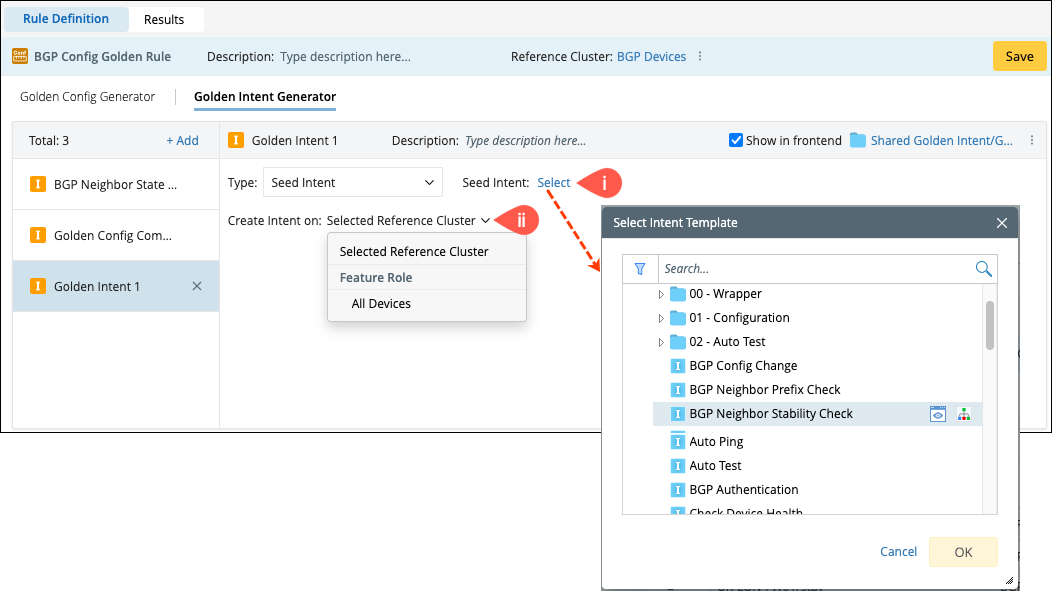 Select the device scope to create Intent on either Selected Reference Cluster or All devices of the network.