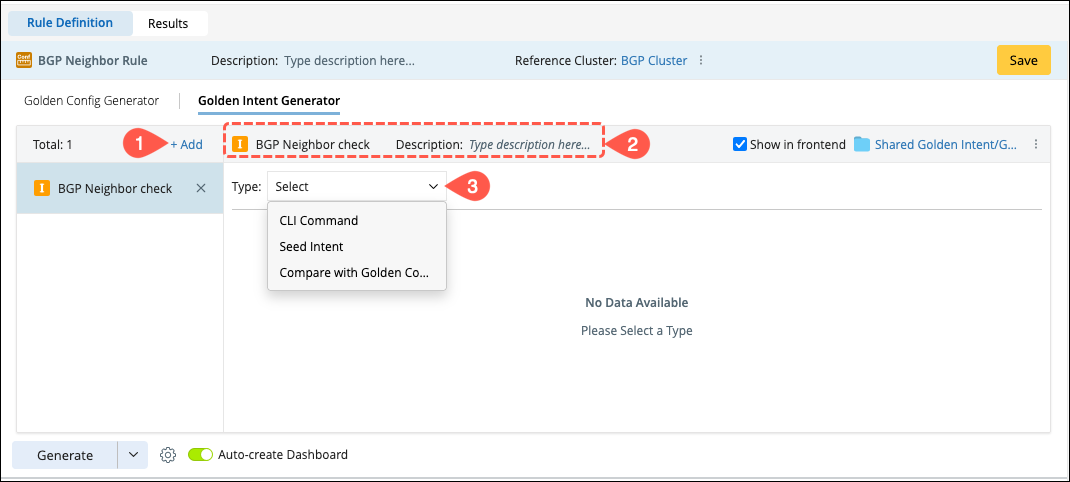 Note: Compare with Golden Config will not be available in the Type menu if a reference cluster is not selected. - Turn ON the Auto-create Dashboard.