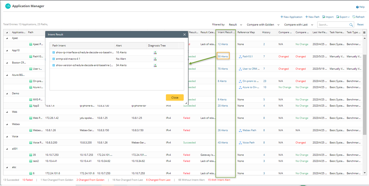 - View path intent execution results in Application Manager: The path calculation results displayed in the Application Manager contain information about execution results of the path intents associated with this path in the Path Intent Result column, indicating if alerts or status codes are generated. Click the number of Alerts to view the Alerts generated from each of the path intents.
