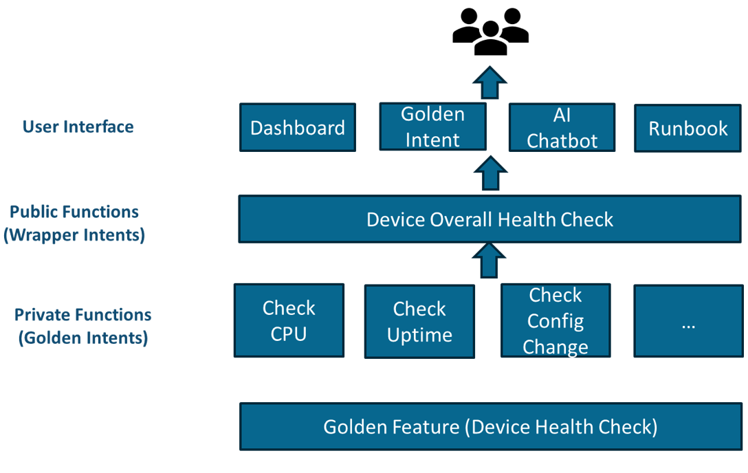 The individual intents can be grouped to troubleshoot a problem. One way to do this is to create a wrapper intent, which includes all relevant intents as the follow-up intents as a public interface for the end users so that any change of underlined intent will not change the end-user interfaces. A wrapper intent can be used by Dashboard, AI-Bot, and Runbook.