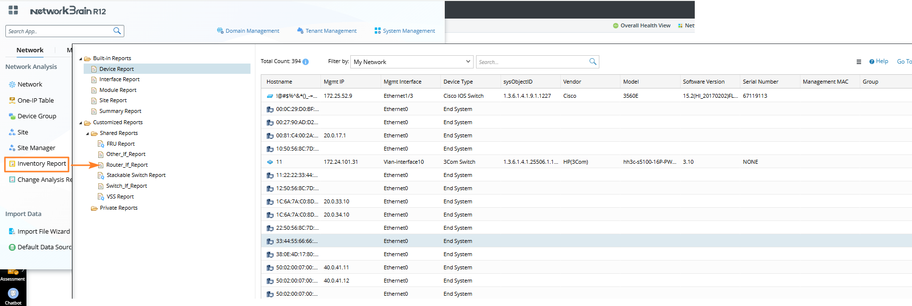 The Inventory Report records comprehensive inventory data of your network, including device data, module data, interface data, site data and more. You can either use Built-in Reports as templates to export or customize your own reports by specifying device scope and asset data.