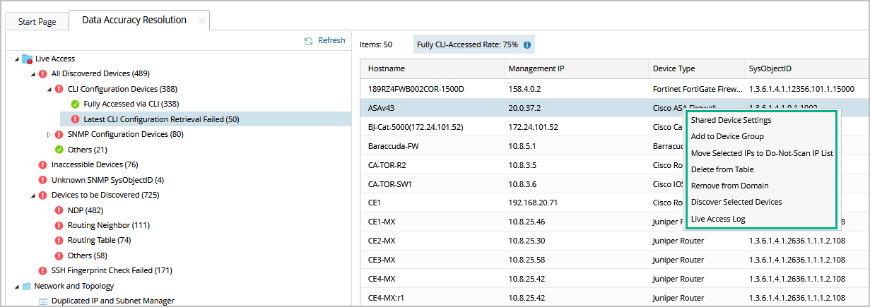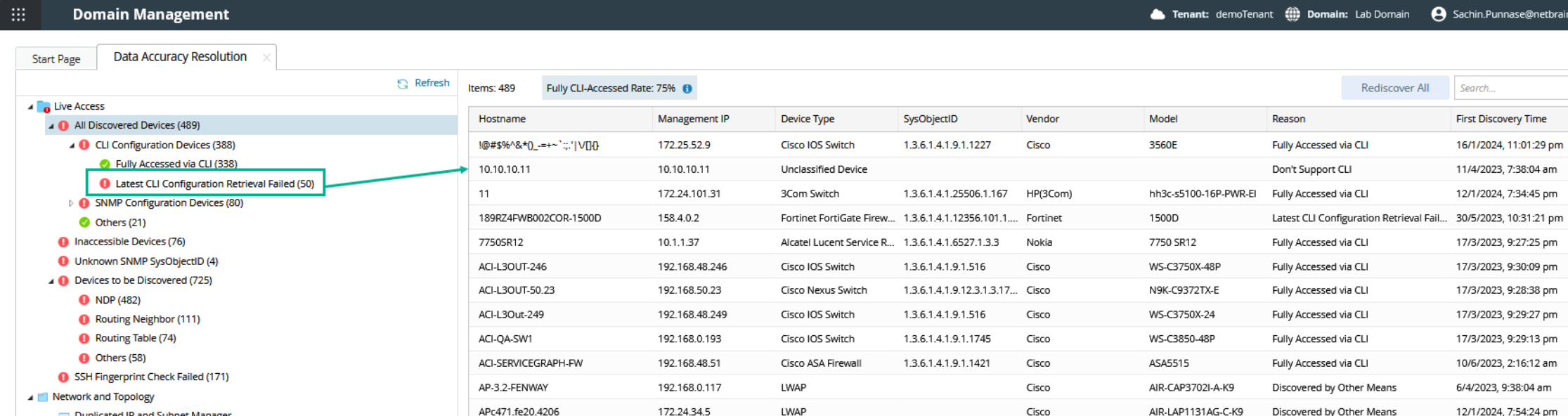 - In the Data Accuracy Resolution tab, click Latest CLI configuration Retrieval Failed in the left pane. All the latest CLI failed devices are listed.