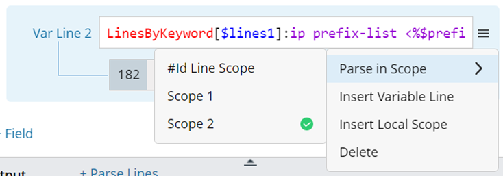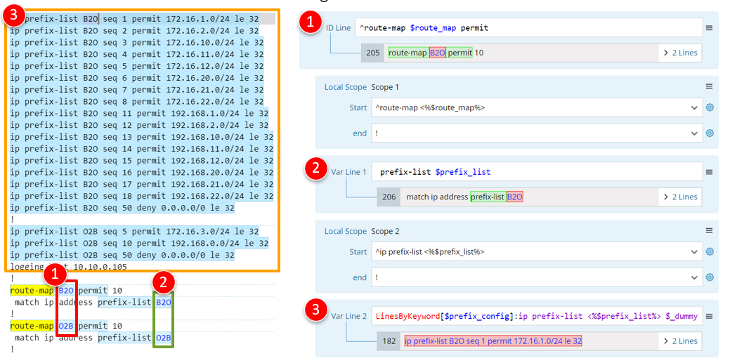- Parse $prefix_list by var line, then define local scope 1 for the var line to parse it correctly. Use the variable template <%$route_map%> to define the start line of the local scope.
