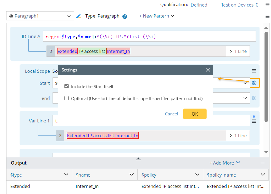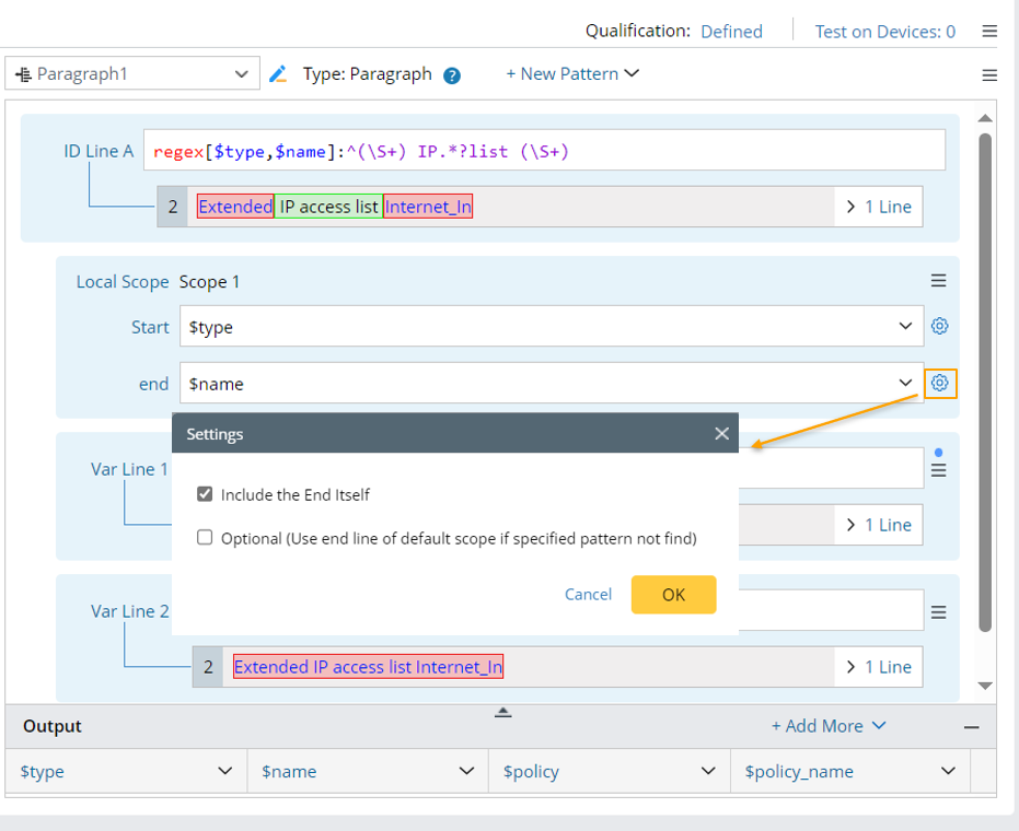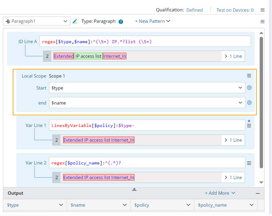 Local scope can be added to define the text scope for var line and can apply to any var line after it. One or more local scopes can be defined in one pattern. This function is suitable for parsing configurations that have multi-level relationship through a single pattern.
