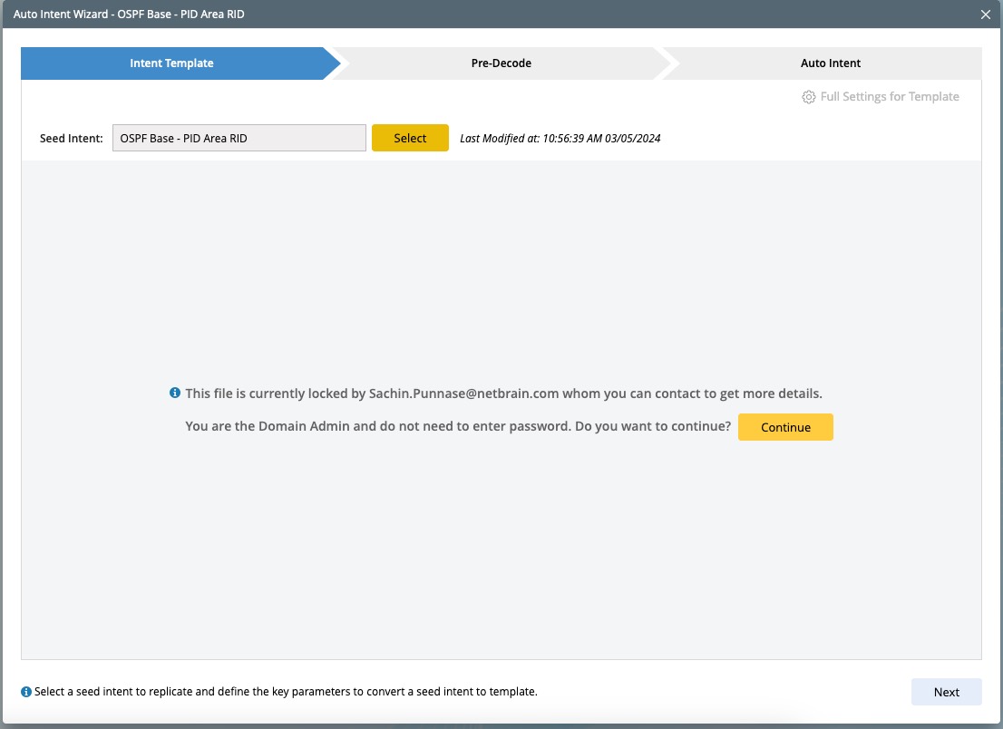 - For system admin and domain admin: Users who are system admin or domain admin have the privilege to edit a locked intent file and can click Continue to proceed.