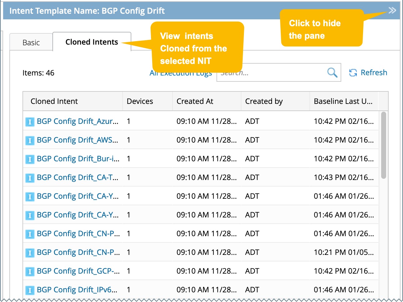 - Intent Template Name: Name of the NIT. You can click the intent name of an item (the link to the NIT, which will navigate to the NI Editor) to view intent details in the View Mode, where you can click Edit to modify the intent.