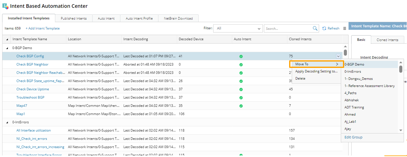 Move NITs: Click Move To from the drop-down menu of an intent item and select a group from the folder list to the right to move the intent to another group.
