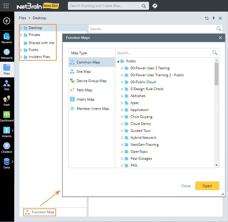 - Function Map — a central place to manage and display all types of maps, including Common Map, Site Map, Device Group Map, Path Map, Intent Map and Member Intent Map. It is located at the bottom of the Files pane.