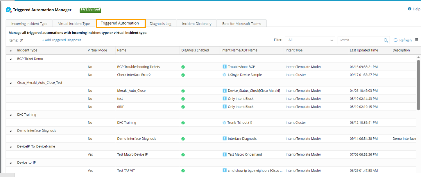 All the configured Triggered Automations are displayed and managed in Triggered Automation Manager, including the intents, intent clusters, intent templates and ADTs installed for triggered automation. The system allows to perform operations on the triggered automations in Triggered Automation Manager.