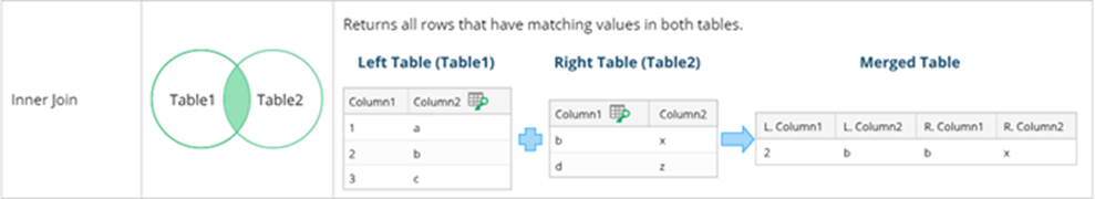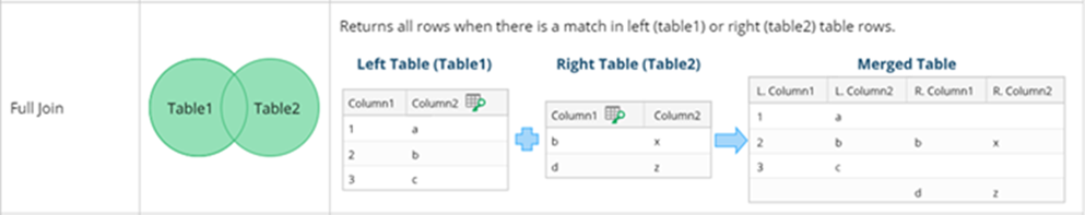 The Merge Table process follows three table merging rules: Full Join, Inner Join and Left Join.