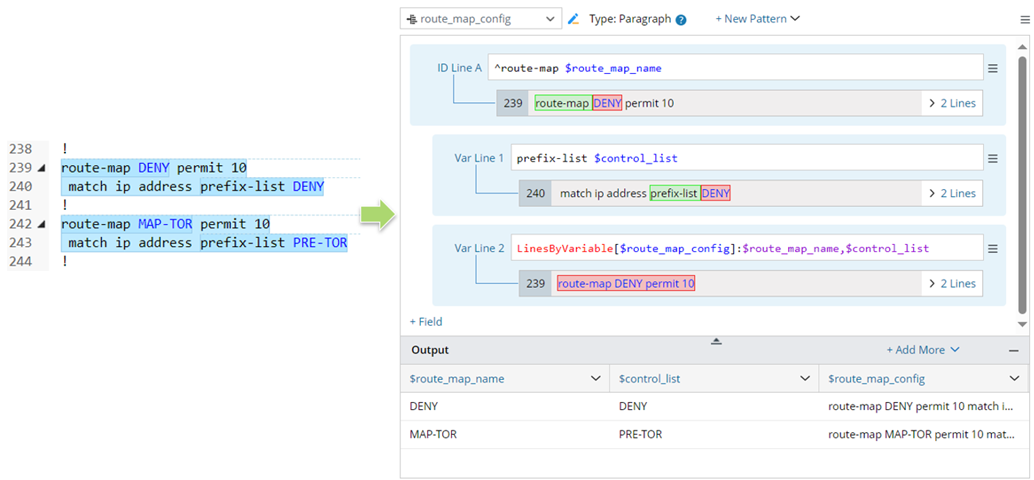 - For Source Table 1: Create a paragraph pattern to parse variables $route_map_name, $control_list and $route_map_config.