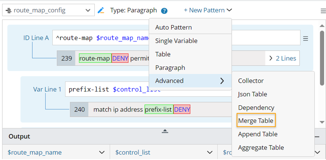 - Click +New Pattern > Advanced > Merge Table, then, a merge table pattern is created.