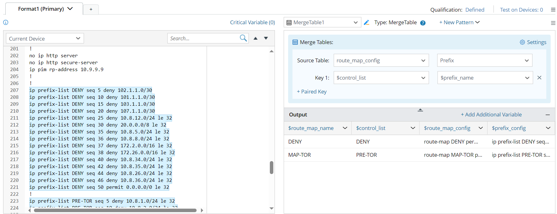 - In the Source Table field of the right pane of this merge table pattern, select two source tables (in this example, output tables route_map_config, Prefix from the current parser are selected) to be merged.
