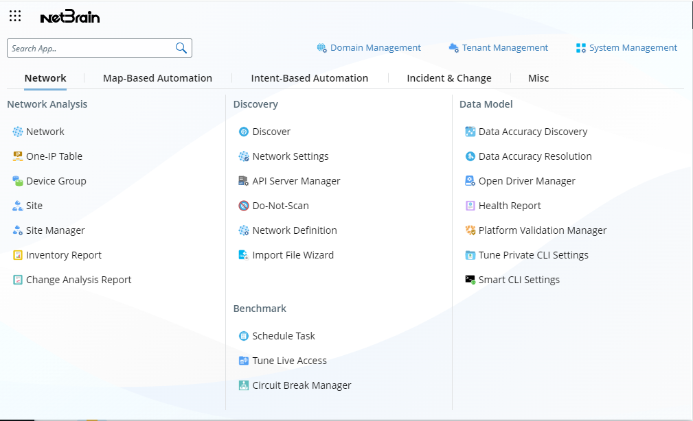 ![]() | This is the Start menu where you can access the main NetworkBrain functions. The Start menu opens as follows and it has five categories: Network, Map-Based Automation, Intent-Based Automation, Incident & Change, and Misc.