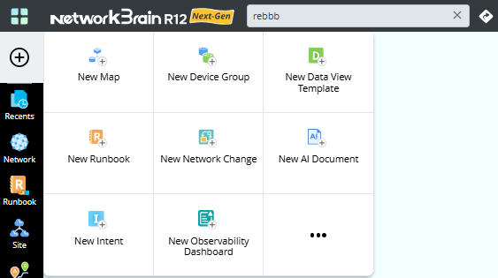 | Create a map, device group, data view template, network intent or network intent template, ADT, runbook, intent dashboard, or network change task. See New Map, New Device Group, New Data View Template, New Intent, New ADT, New Runbook, New Intent Dashboard, and New Network Change for more details. You can also click ··· to create more, such as New Bot, New Parser, New Network Cluster, and New Qapp. | ||