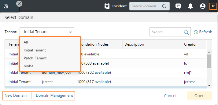 The Incident Search Bar allows you to search incidents in the current domain. Enter search keywords in the Incident Search Bar to search incidents in the current domain. See Work on Incident Pane for more details.
