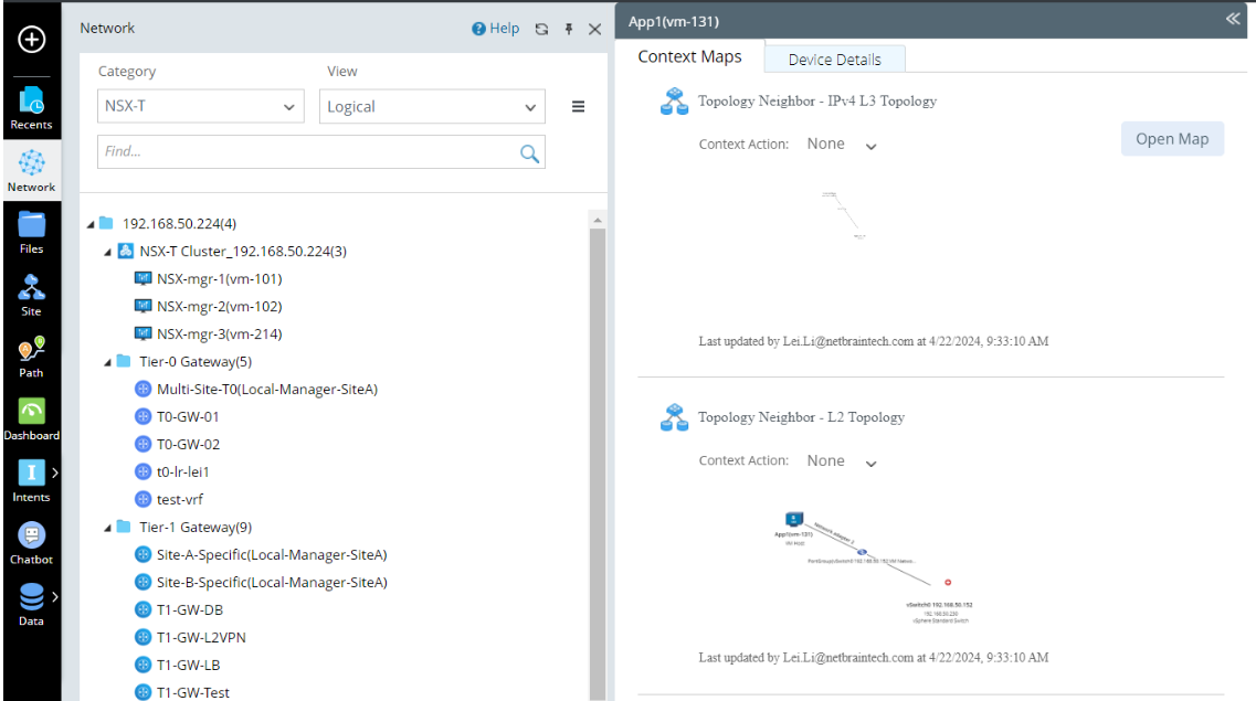 - Expand the network tree and select a node to view the context maps of a node.