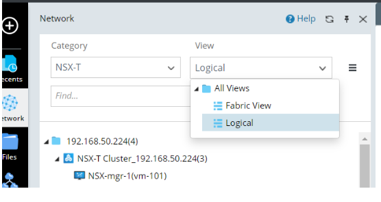 - In the Network pane, select NSX-T in the Category field and Fabric View or Logical in the View field.