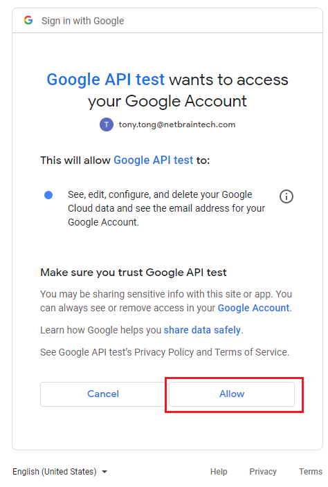 - Click Allow to authorize the API access.