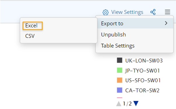 icon from a view to open the main menu of view. - Select Export to > CSV. The view will be exported to CSV format and will be saved in the local default folder.