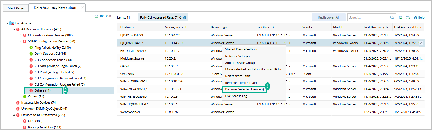 - Select one or more entries in the table by pressing the Ctrl or Shift key, right-click them, and selecting Discover Selected Device(s).