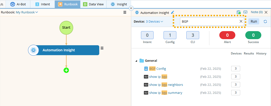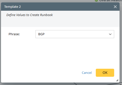 Example: Set a search phrase in the template and use it to create a new runbook showing automations with the phrase ‘BGP’.- Select Search Phrase as the item and name it Phrase.