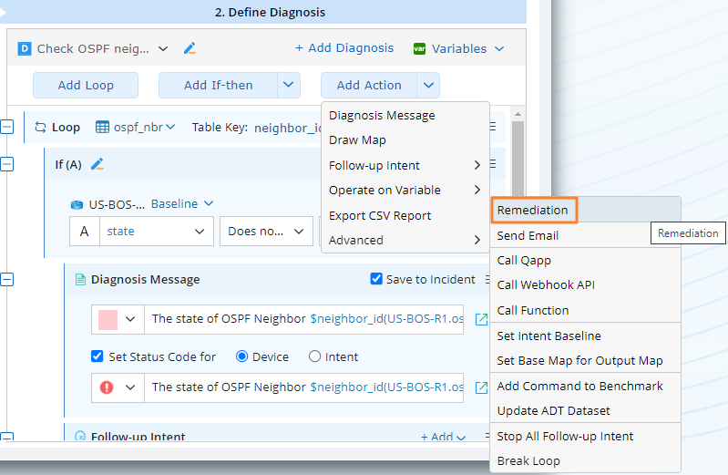 - In an NI diagnosis, navigate to Add Action > Advanced > Remediation to complete the remediation definition.