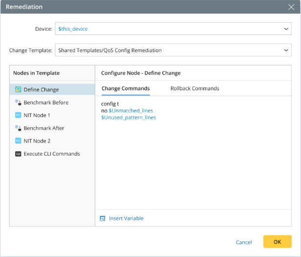 | Define Change | ![]() | You can directly define the command to change network and define the rollback command in case of the network change needs to be cancelled. NI variables can be inserted in these commands, and during NI execution, they will be replaced with actual values. The rules for inserting variables here are the same as those used in defining variables within diagnosis messages. |