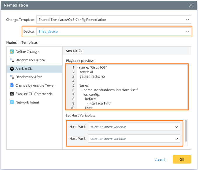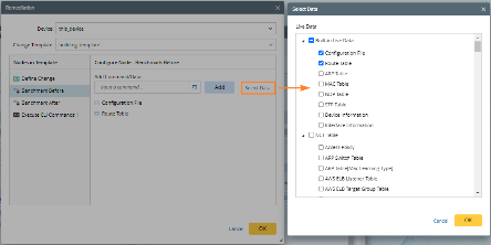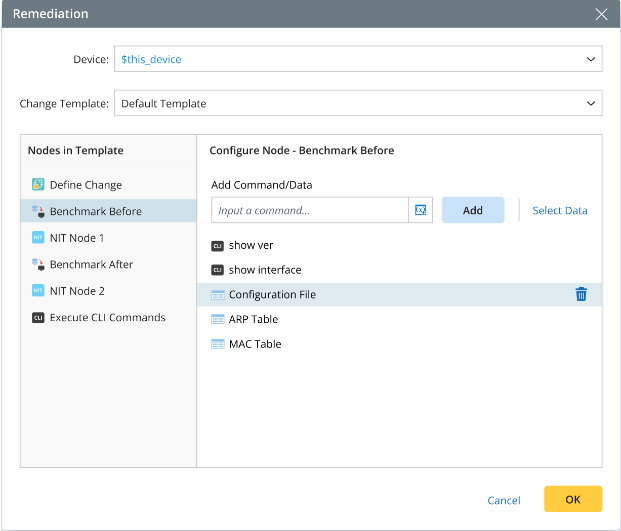 | Retrieve Live Data | ![]() | Define how to benchmark before/after the change, especially by specifying CLI commands or built-in data. NI variables can be used in the CLI commands, for example, show interface $intf.