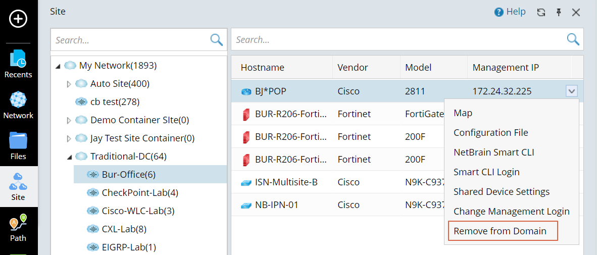 NetworkBrain provides many ways to remove devices from a domain and user can select either of the following ways to remove devices: