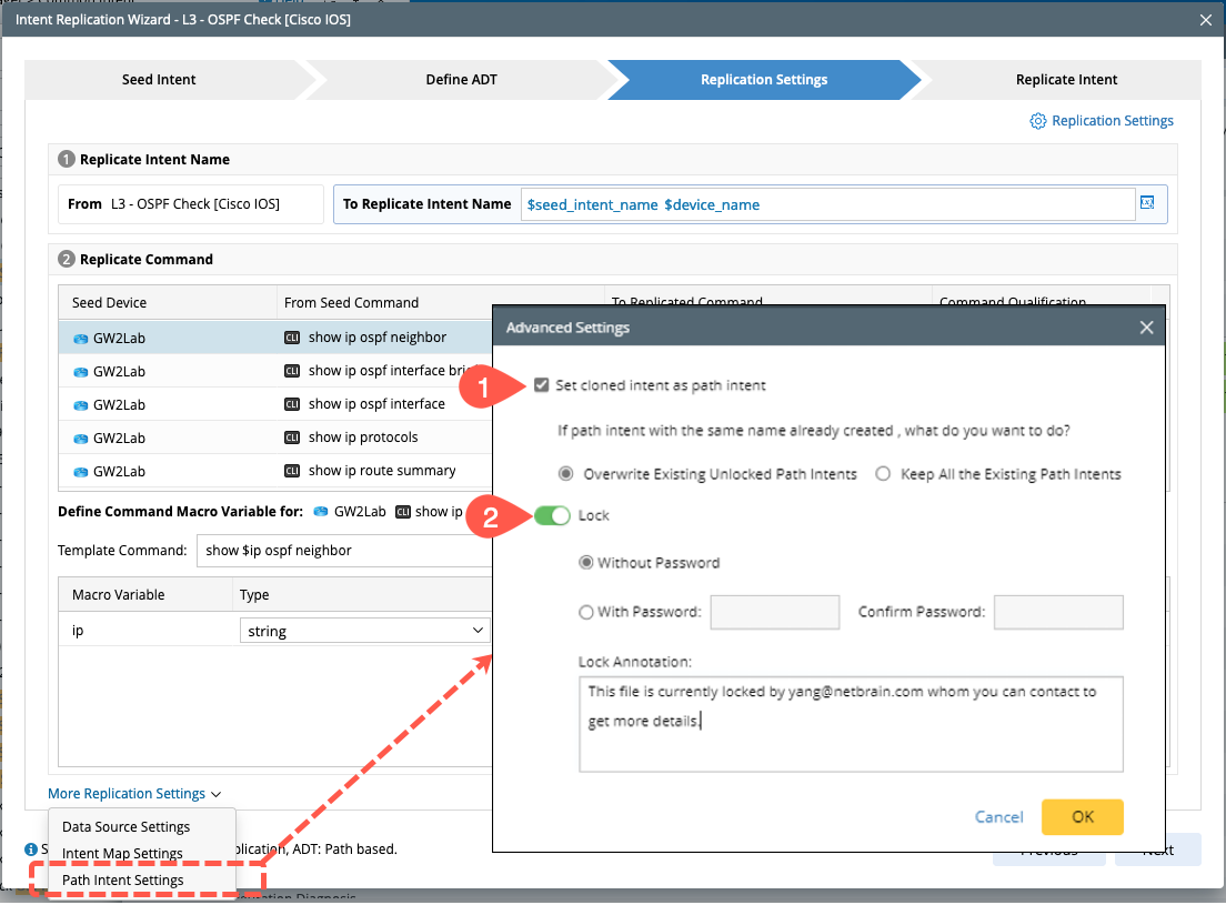 This setting applies to Path based Replication only. In this section, define whether to overwrite the existing path intent if the created path intent has the same name and configure the lock the settings to created path intent as follows: