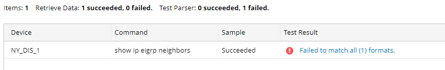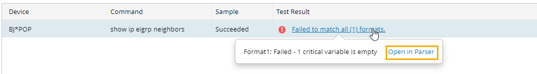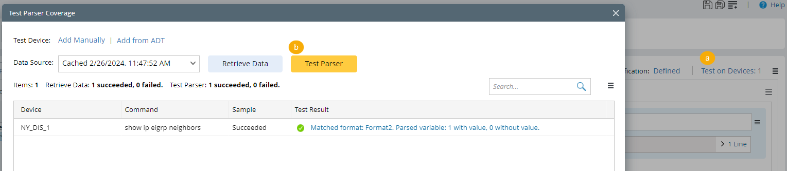 - Click Test on Devices:1 to navigate back to the Test Parser Coverage window.