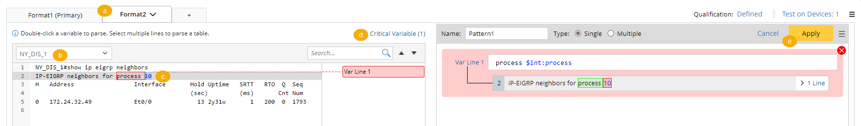 Example: Use CLI Command (show ip eigrp neighbors) to retrieve data on a Cisco Router, SanJose_Core. Parse value from for AS(10) , and define the variable($as_num) as a Critical Variable, which means this variable must have value.
